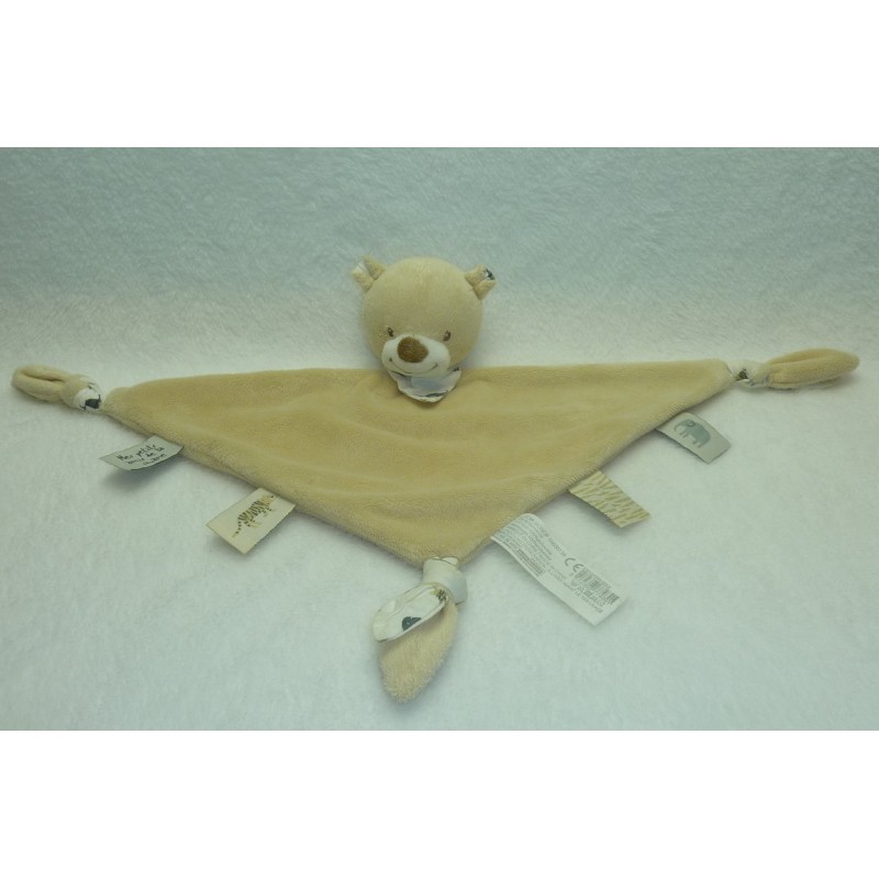 Description du doudou : Doudou plat ours de 30 cm environ de longueur, forme triangle bordé d'étiquettes, 3 nouages. Coloris : beige. Etat : Très bon état car le doudou est encore super doux et impeccable mais le tissu des nouages est taché. Produit original. DOUDOU DIFFICILE A TROUVER