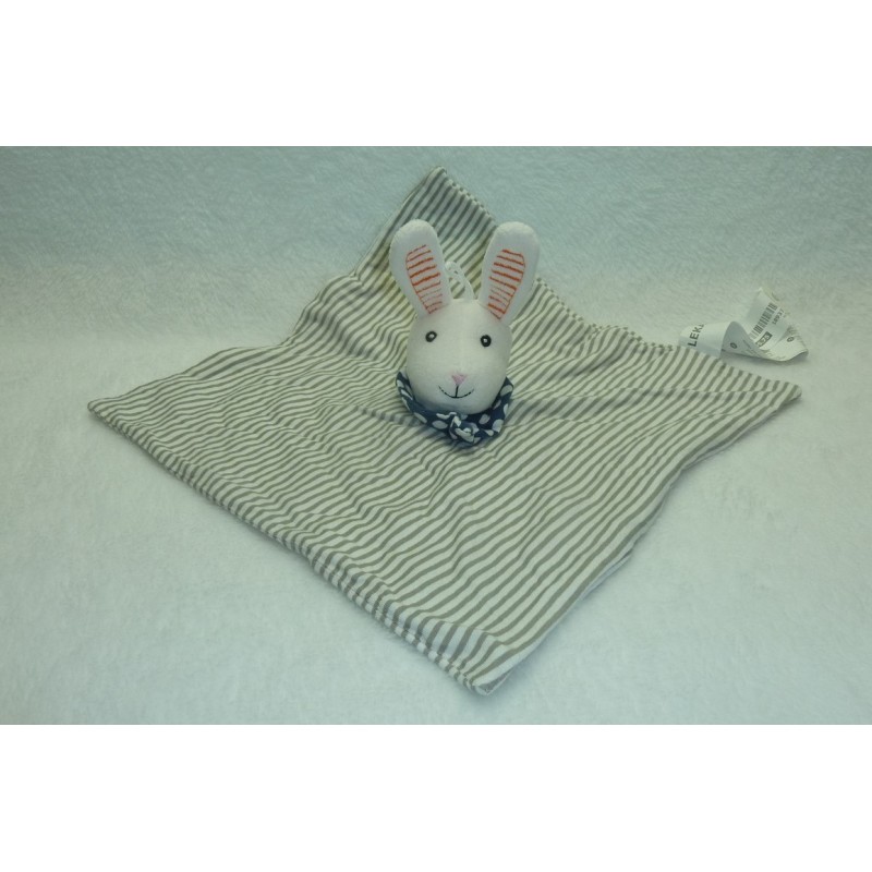 Description du doudou : Doudou plat lapin de 28,5x27 cm environ. Coloris : rayures blanc, gris, écharpe bleu pois blanc. Etat : Comme neuf. Produit original. DOUDOU DIFFICILE A TROUVER