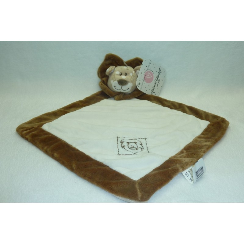 Description du doudou : Doudou plat lion forme losange de 41 cm environ de longueur, grelot. Coloris : blanc, marron, tête de lion brodée, verso; marron clair pois blancs. Etat : Neuf. Produit original. DOUDOU DIFFICILE A TROUVER