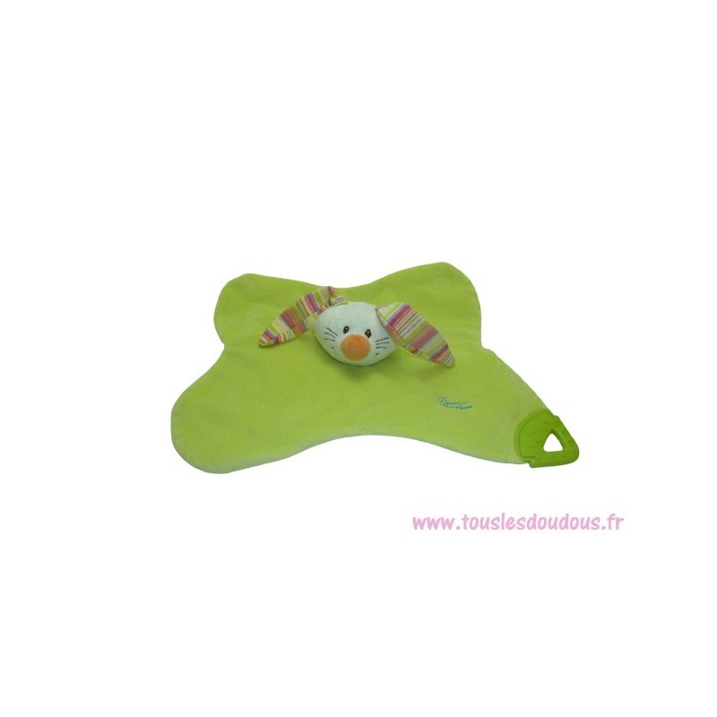Doudou plat lapin27x25 cm environ, grelot, anneau de dentition, vert et bleu au verso, Tiamo Collection brodé. Etat : Comme neuf (étiquette de la marque coupée). SOS DOUDOU DIFFICILE A TROUVER.