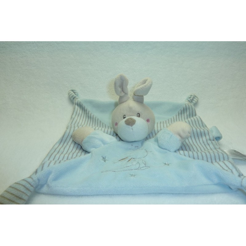 Description du doudou : Doudou plat lapin de 23x23 cm environ. Coloris : bleu, lapin et étoiles brodés. Etat : Très bon état. Produit original. DOUDOU DIFFICILE A TROUVER