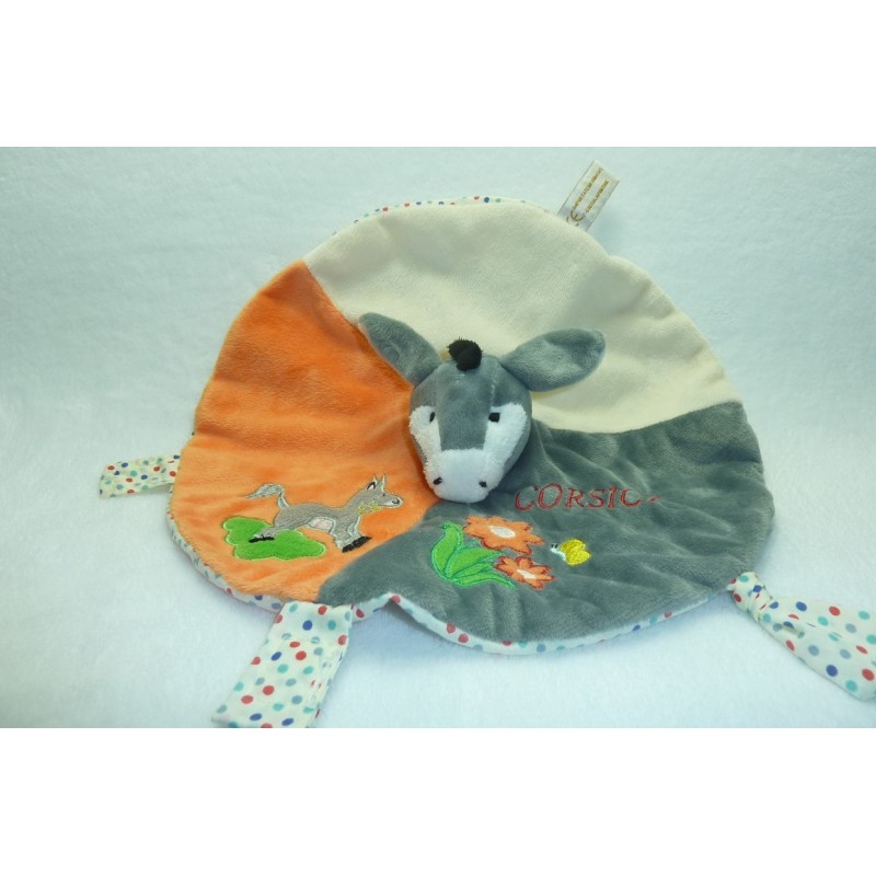 Description du doudou : Doudou plat âne, forme ronde de 28 cm environ de large, attache tétine par velcro. Coloris : orange, gris, écru, âne, fleurs et Corsica Brodés, imprimé pois au verso. Etat : Neuf sans étiquette boutique. DOUDOU DIFFICILE A TROUVER