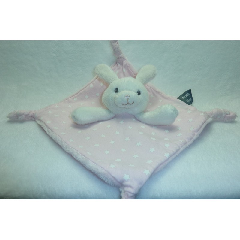 Description du doudou : Doudou plat lapin de 21x21 cm environ, 4 nouages. Coloris : rose imprimé étoiles. Doudou super doux. Etat : Excellent état. Produit original. DOUDOU DIFFICILE A TROUVER