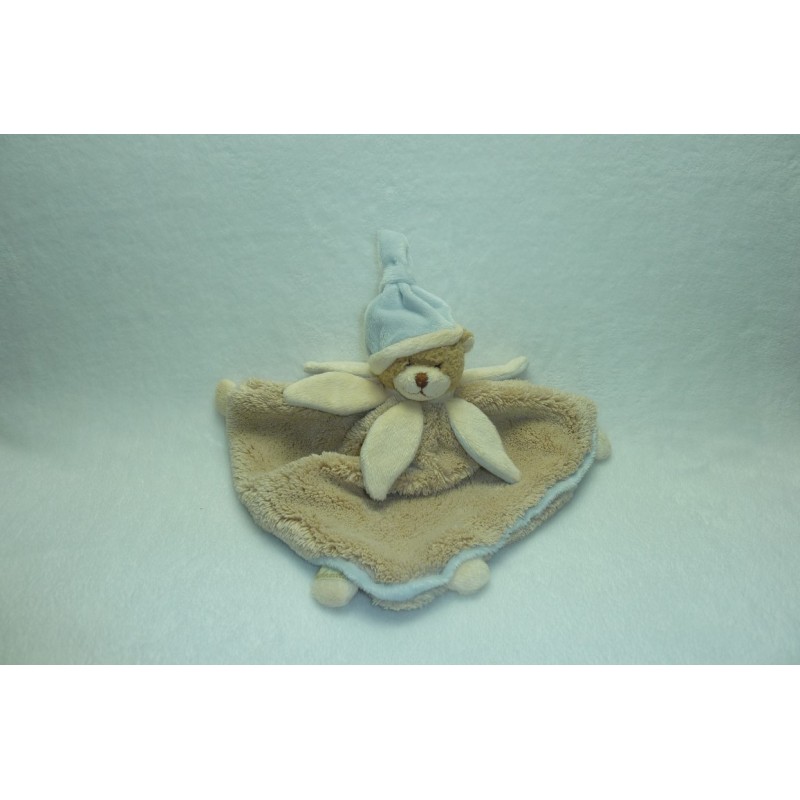 Description du doudou : Doudou plat ours de 36 cm environ. Coloris :marron clair, bleu, écru. Etat : comme neuf (étiquette code barre coupée à l'arrière). Produit original. DOUDOU DIFFICILE A TROUVER