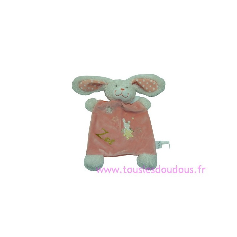 Description du doudou : Doudou plat lapin de 25 cm environ sans les oreilles. Coloris : saumon, motifs : étoiles, lapin. Prénom de Zoé sur le doudou. Doudou super doux. Etat : Très bon état. SOS DOUDOU DIFFICILE A TROUVER.