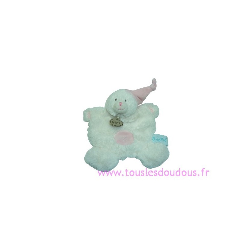 Description du doudou : Doudou plat ours de 18 cm environ sans le bonnet. Coloris : blanc, rose. Etat : Neuf sans étiquette boutique. SOS DOUDOU DIFFICILE A TROUVER