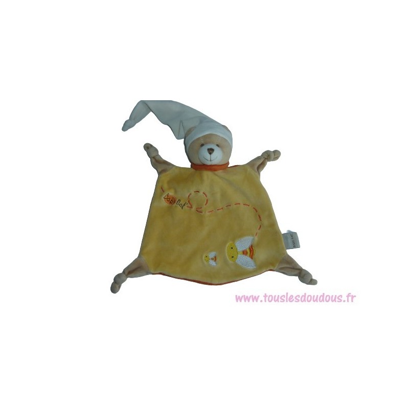 Doudou plat ours 23 cm environ (sans le bonnet), jaune orange, abeilles. Etat : Bon état. SOS DOUDOU DIFFICILE A TROUVER.