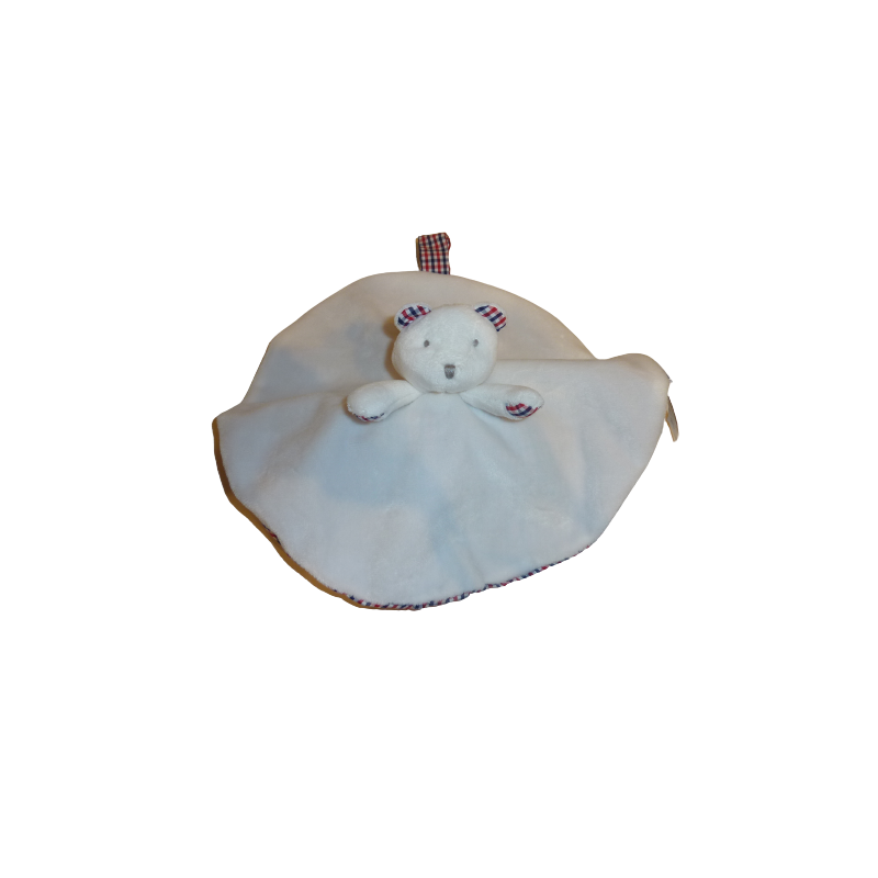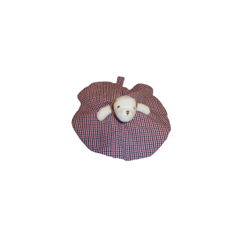 Doudou plat réversible ours chien, forme ronde 23 cm environ, attache tétine, blanc quadrillage rouge bleu. Etat : Neuf sans étiquette boutique. DOUDOU DIFFICILE A TROUVER.