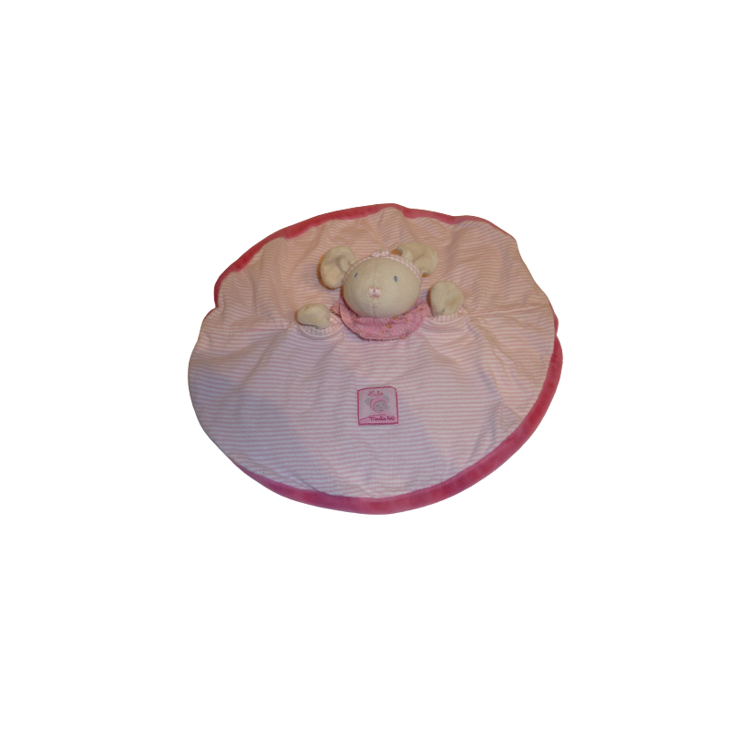 Doudou plat souris forme ronde 29 cm environ, rose. Etat : Très bon état. DOUDOU DIFFICILE A TROUVER.