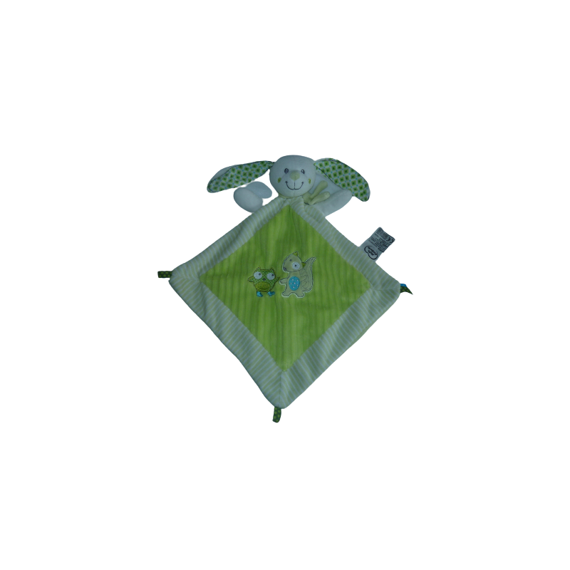 Doudou plat lapin forme losange 36 cm environ sans les oreilles, vert motif hibou renard. Etat : Comme neuf. DOUDOU DIFFICILE A TROUVER.