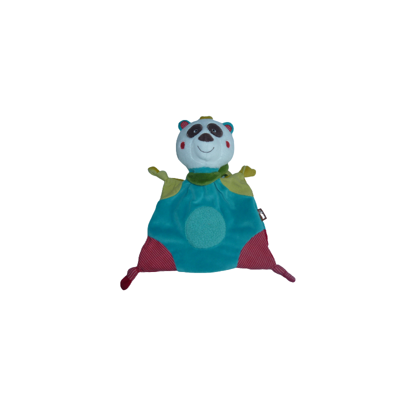 Doudou plat panda 33 cm environ, turquoise vert rouge. Etat : Comme neuf. DOUDOU DIFFICILE A TROUVER.