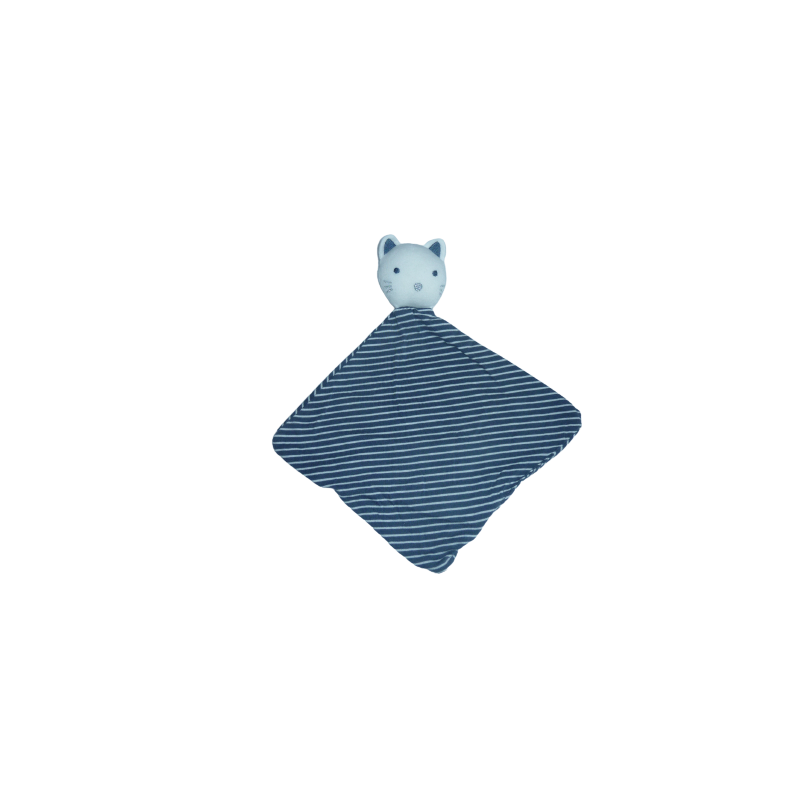 Doudou plat chat forme losange 29 cm environ, rayures bleu blanc. Etat : Comme neuf. DOUDOU DIFFICILE A TROUVER.
