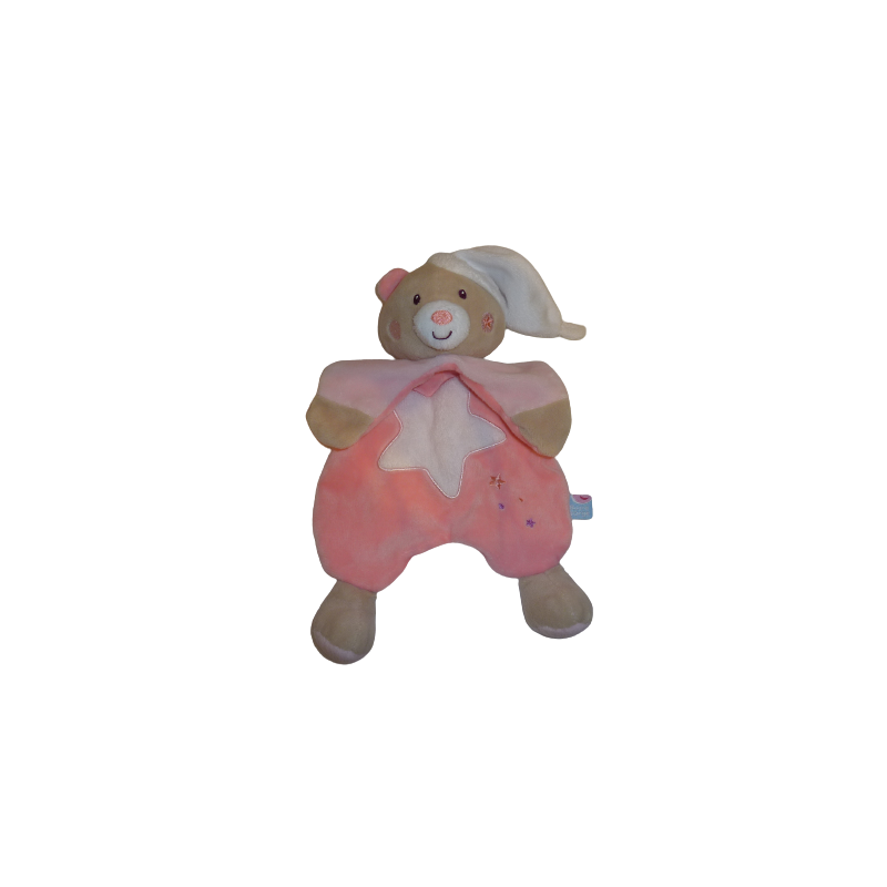 Doudou plat ours 27 cm environ, rose blanc motif étoiles. Etat : Neuf sans étiquette boutique. DOUDOU DIFFICILE A TROUVER.