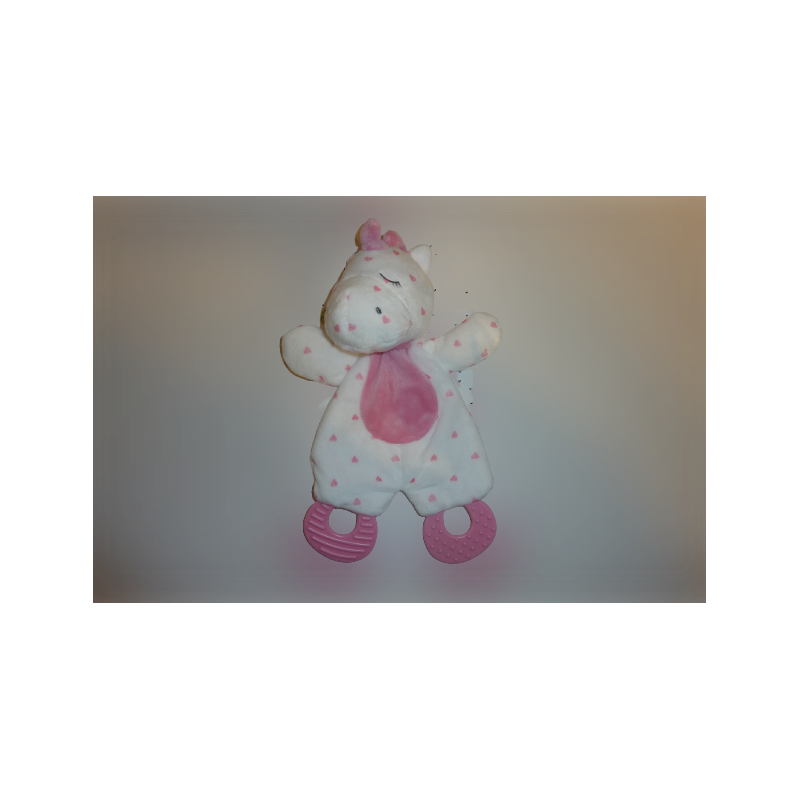Doudou plat licorne 26 cm environ, anneaux de dentition, matière bruissante, rose blanc motif coeur. Etat : Neuf. DOUDOU DIFFICILE A TROUVER.