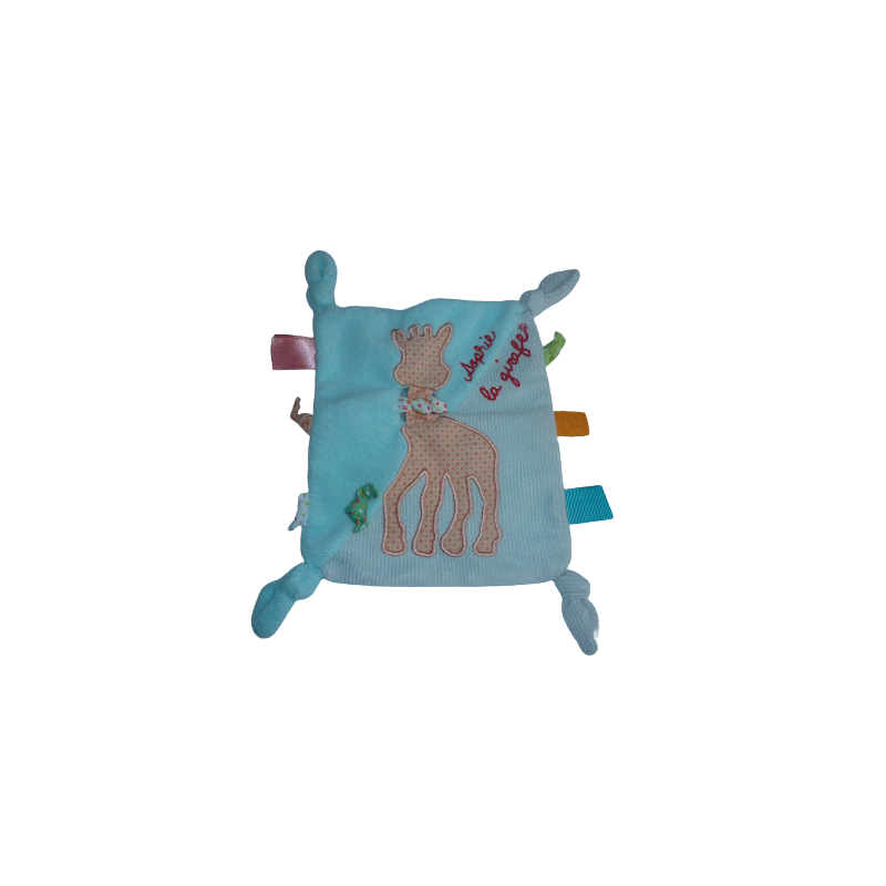 Doudou plat Sophie la Girafe 18x18 cm environ, 4 nouages, bleu gris motif Girafe. Etat : Comme neuf. DOUDOU DIFFICILE A TROUVER.Destinataire :