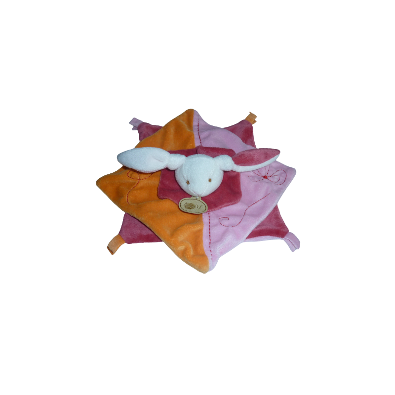 Doudou plat lapin 20x20 cm environ, orange rose. Etat : Comme neuf. DOUDOU DIFFICILE A TROUVER.
