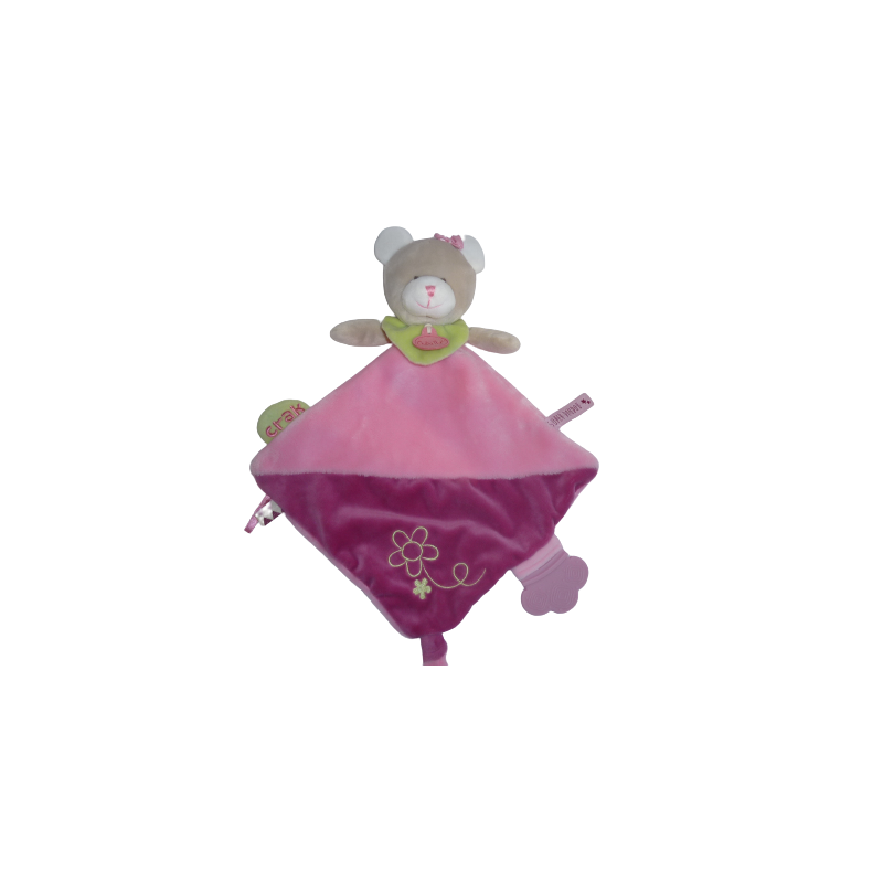 Doudou plat ours forme losange 42 cm environ, anneau dentition, matière bruissante, rose fushia. Etat : Comme neuf (étiquette de la marque coupée). DOUDOU DIFFICILE A TROUVER.