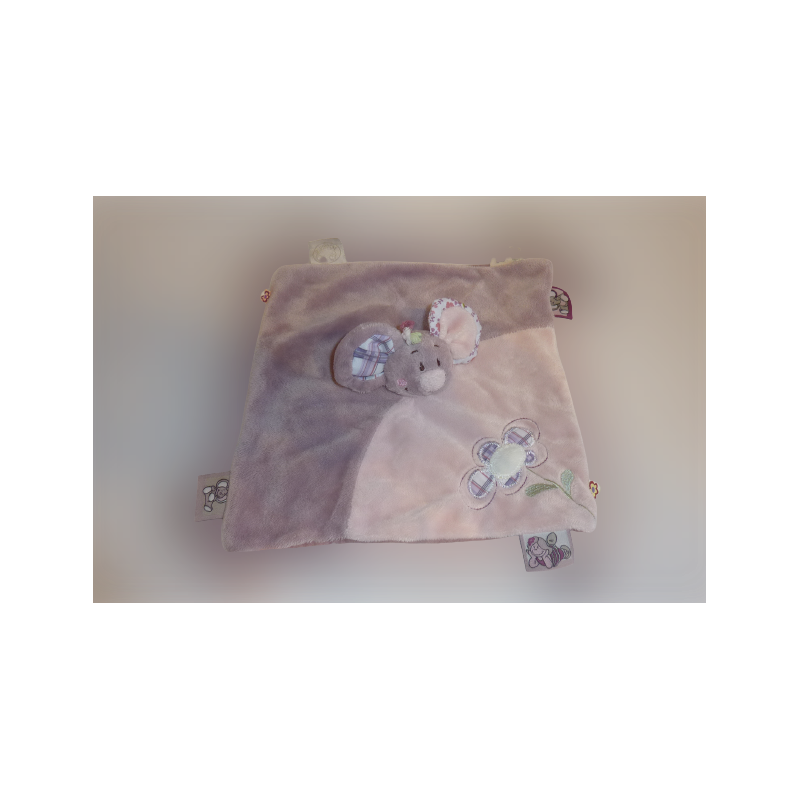 Doudou plat éléphant 25x26 cm environ, attache tétine par velcro, rose, parme, motif fleurs. Etat : Comme neuf. DOUDOU DIFFICILE A TROUVER.