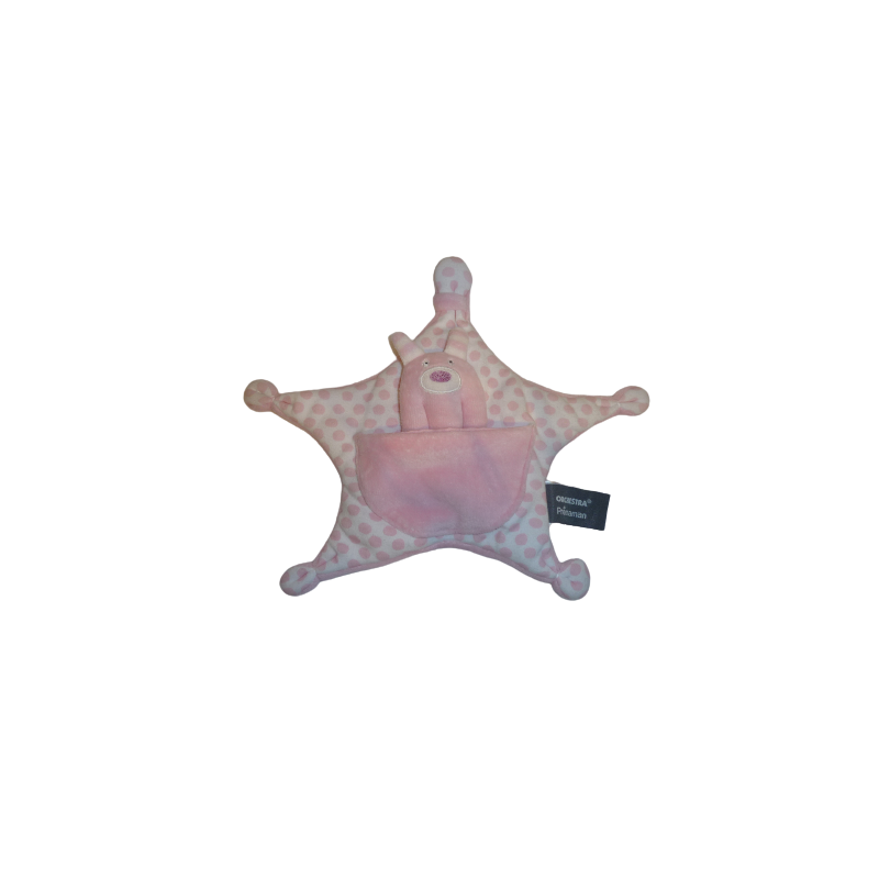 Doudou plat lapin dans une petite poche, forme étoile, velcro pour attache tétine 28 cm de large environ, rose blanc pois. Etat : Comme neuf. DOUDOU DIFFICILE A TROUVER.Destinataire :