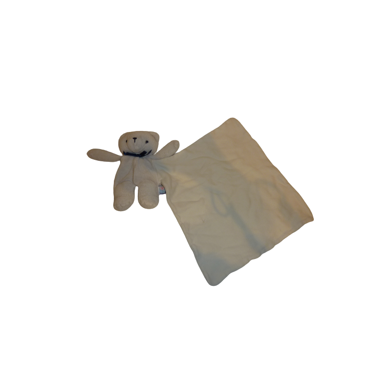 Doudou plat ours mouchoir 41 cm environ, blanc. Etat : Occasion bon état (le blanc a grisé un peu), idéal doudou de secours. DOUDOU DIFFICILE A TROUVER.