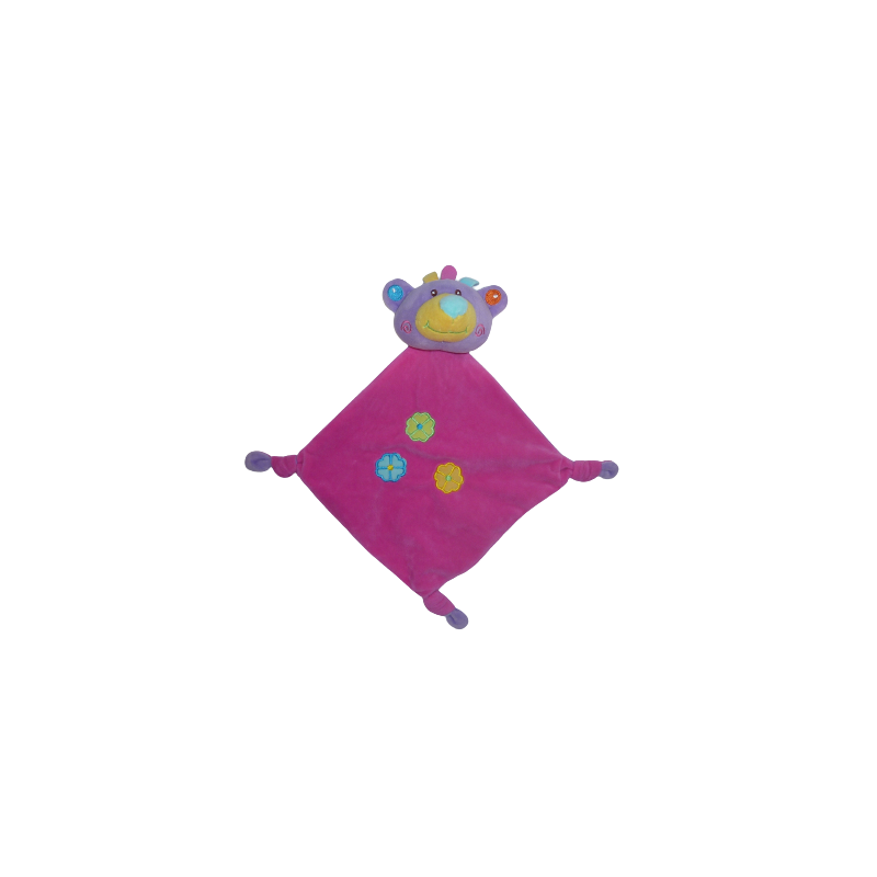 Doudou ours plat forme losange 34 cm environ,grelot, 3 nouages, fushia, violet motif fleurs. Comme neuf (étiquette de la marque coupée). DOUDOU DIFFICILE A TROUVER.Destinataire :