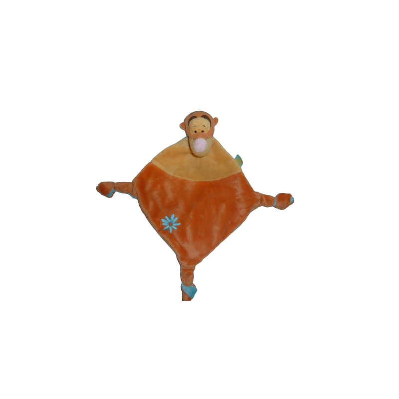 Doudou Tigrou plat forme losange 3 nouages 30 cm environ sans compter les nouages, orange marron turquoise fleur brodée. Etat : Occasion bon état général. DOUDOU DIFFICILE A TROUVER.Destinataire :