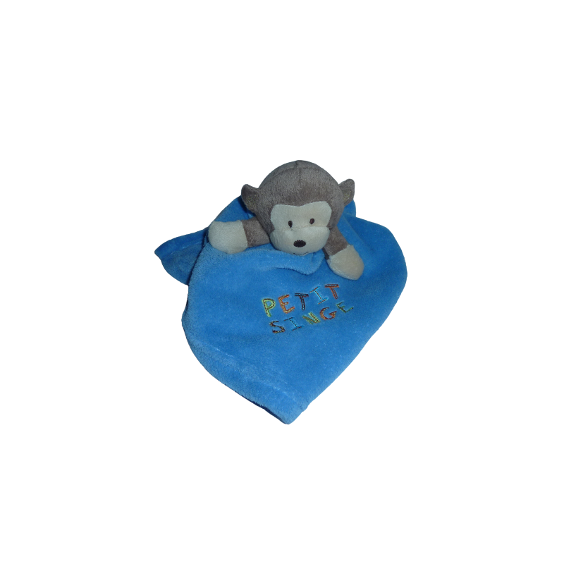 Doudou plat singe 38x46 cm environ, bleu Petit singe brodé. Etat : Comme neuf (étiquette de la marque coupée). DOUDOU DIFFICILE A TROUVER.Destinataire :