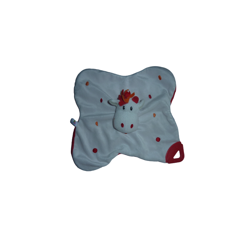 Doudou plat cheval ou girafe 22 cm environ de large, grelot, anneau de dentition, blanc rouge. Etat : Très bon état général (étiquette de la marque coupée). DOUDOU DIFFICILE A TROUVER.