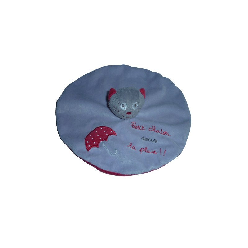 Doudou plat chat forme ronde ,27 cm environ, parme rouge, Petit chaton sous la pluie et parapluie brodés. Etat : Comme neuf (étiquette de la marque coupée). DOUDOU DIFFICILE A TROUVER.Destinataire :