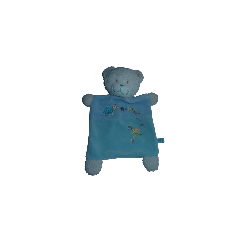 Doudou plat ours 28 cm environ, bleu. Etat : Bon état (minous incrustés, rien de méchant). DOUDOU DIFFICILE A TROUVER.