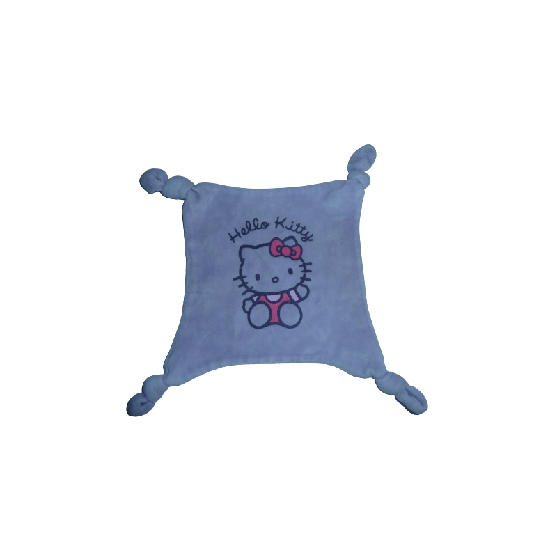 Doudou carré plat Hello Kitty 22x22 cm environ, 4 nouages, mauve. Etat : Bon état général (micro tache au verso, idéal doudou de secours). DOUDOU DIFFICILE A TROUVER.Destinataire :