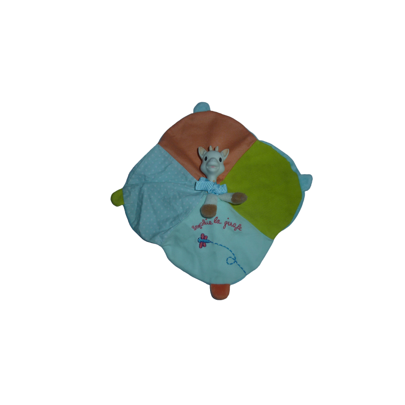 Doudou plat girafe forme ronde anneau dentition 25 cm environ, multicolore. Etat : Très bon état. DOUDOU DIFFICILE A TROUVER.