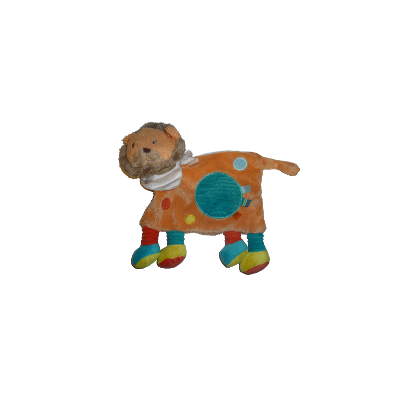 Doudou plat lion 18 cm environ, orange turquoise. Etat : Comme neuf (étiquette de la marque coupée). DOUDOU DIFFICILE A TROUVER.