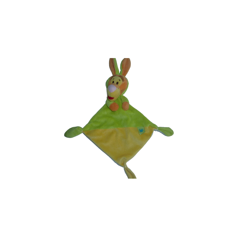 Doudou plat Tigrou forme losange 27 cm environ vert jaune motif pois au verso. Etat : Très bon état. DOUDOU DIFFICILE A TROUVER.