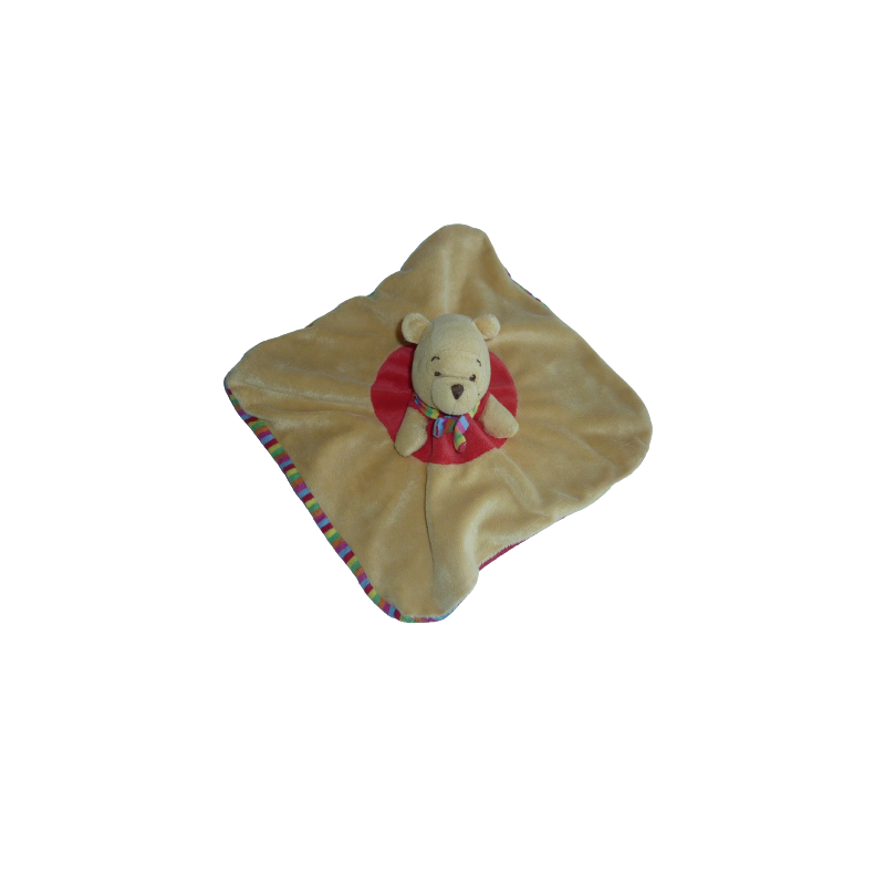 Doudou plat ours Winnie 22x22 cm environ, marron rayures multicolores. Etat : Bon état. DOUDOU DIFFICILE A TROUVER