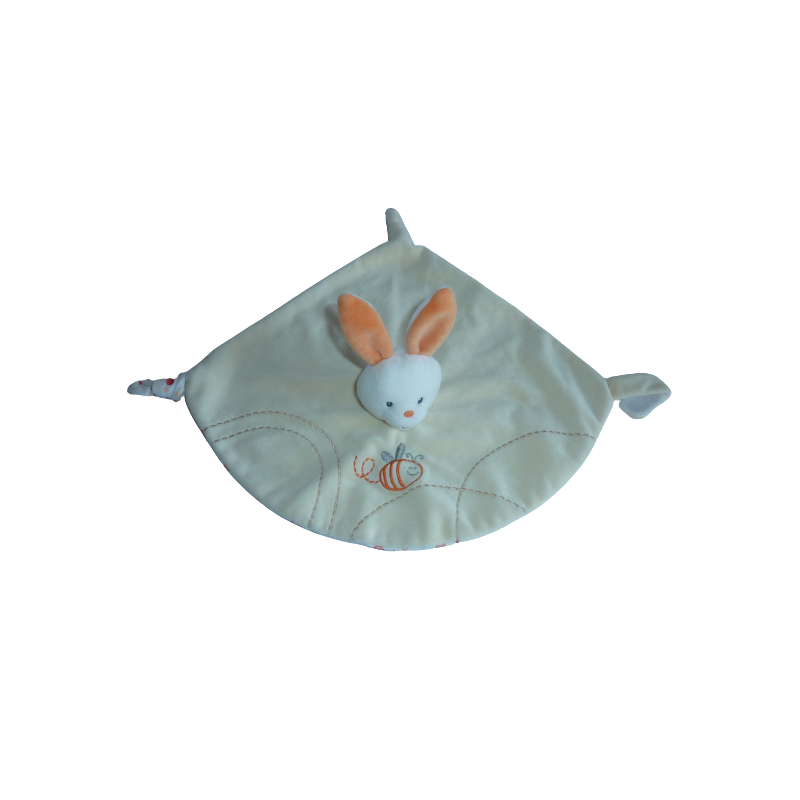 Doudou plat lapin 31 cm environ de large, 2 nouages, attache tétine, jaune et tissu fleuri au verso, motif abeille. Etat : Neuf sans étiquette boutique. DOUDOU DIFFICILE A TROUVER.