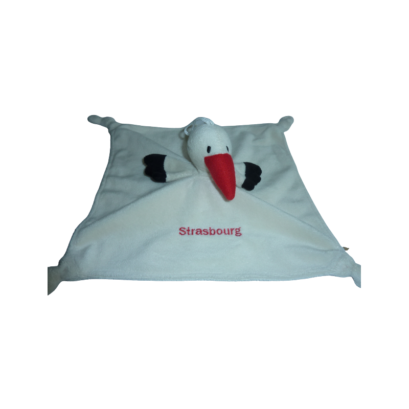 Doudou plat cigogne 27x28 cm environ, 4 nouages, écru, Strasbourg brodé. Etat : Comme neuf. DOUDOU DIFFICILE A TROUVER