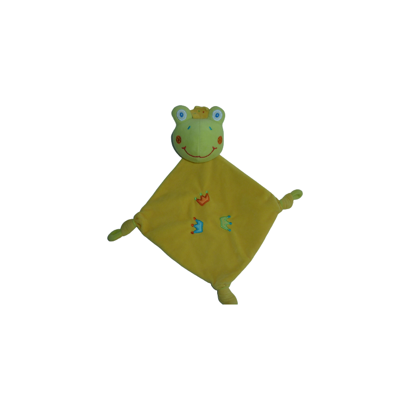 Doudou plat grenouille forme losange 35 cm environ, grelot, 3 nouages , vert jaune, couronnes brodées. Etat : Comme neuf. DOUDOU DIFFICILE A TROUVERDestinataire :