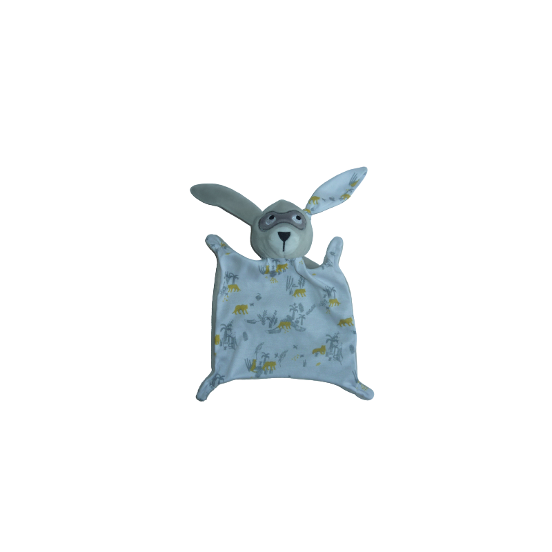 Doudou plat lapin 24 cm environ sans les oreilles, gris motifs. Etat : Neuf sans étiquette boutique. DOUDOU DIFFICILE A TROUVER