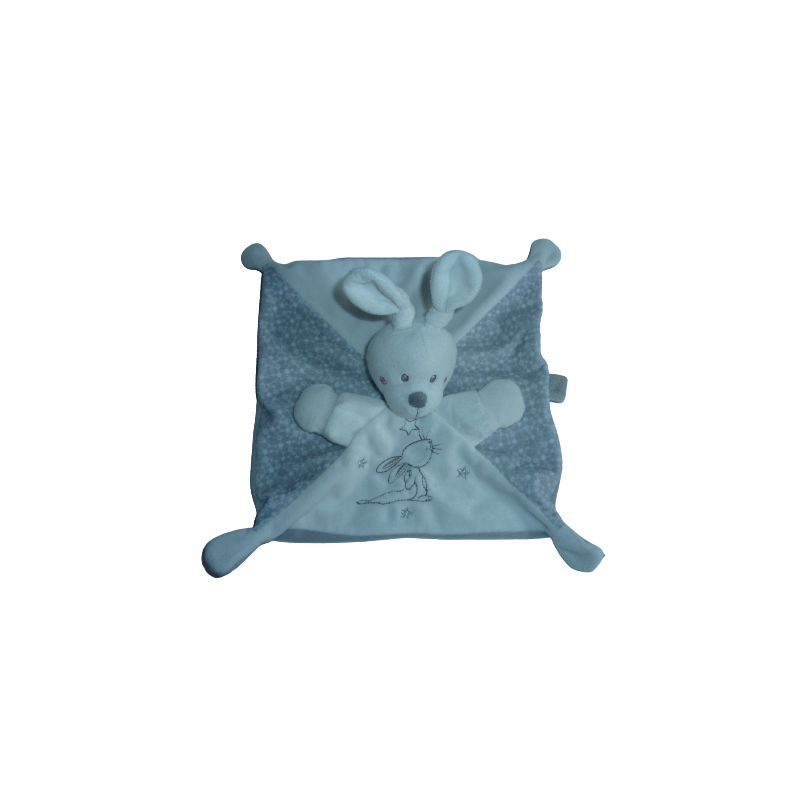 Doudou plat lapin 25x25 cm environ, blanc gris motifs lapin étoiles, attache tétine. Etat : Comme neuf. DOUDOU DIFFICILE A TROUVER