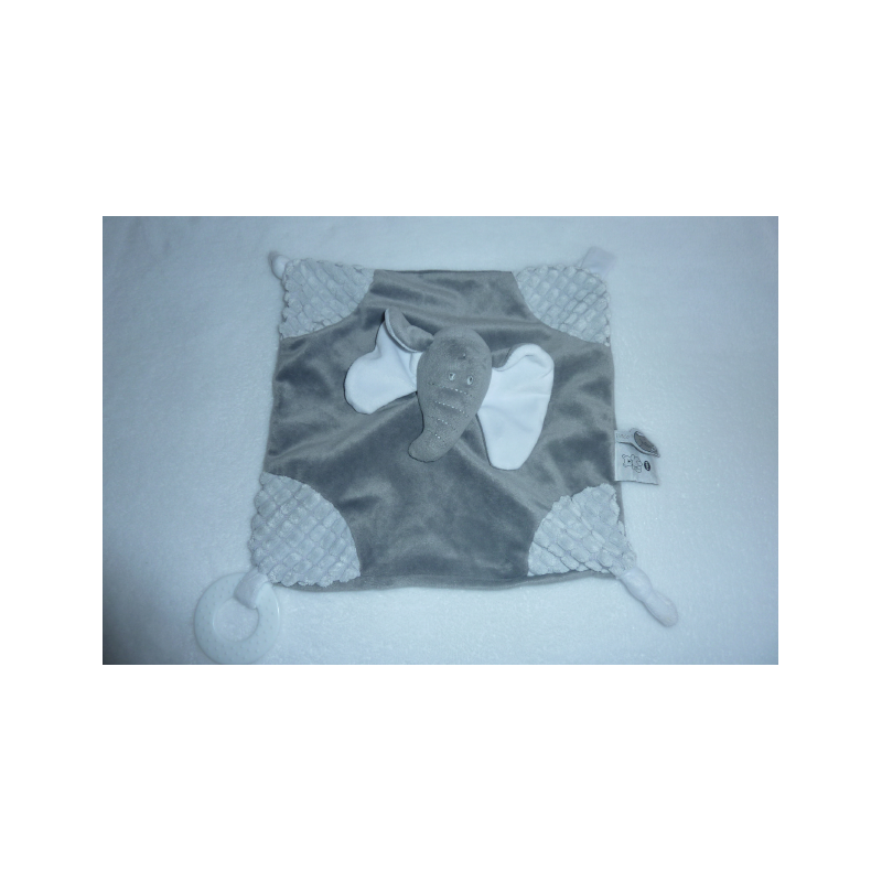 Doudou éléphant plat 27x27 cm environ, anneau de dentition, attache tétine, 2 nouages, gris blanc. Etat : Très bon état (mais micro tache sur les nouages, rien de méchant). DOUDOU DIFFICILE A TROUVERDestinataire :