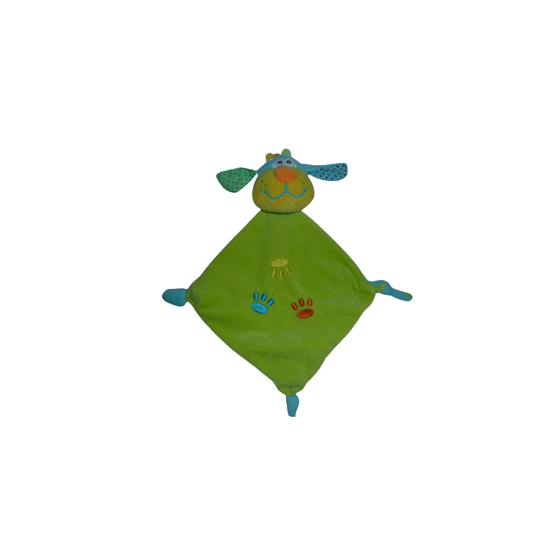 Doudou plat chien forme losange 35 cm environ, 3 nouages, vert bleu . Etat : Comme neuf. DOUDOU DIFFICILE A TROUVER