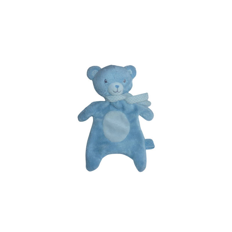 Doudou plat ours 26 cm environ, attache tétine, bleu blanc motif petits pois. Etat : Très très bon état (mais attache tétine n'adhère plus). DOUDOU DIFFICILE A TROUVER