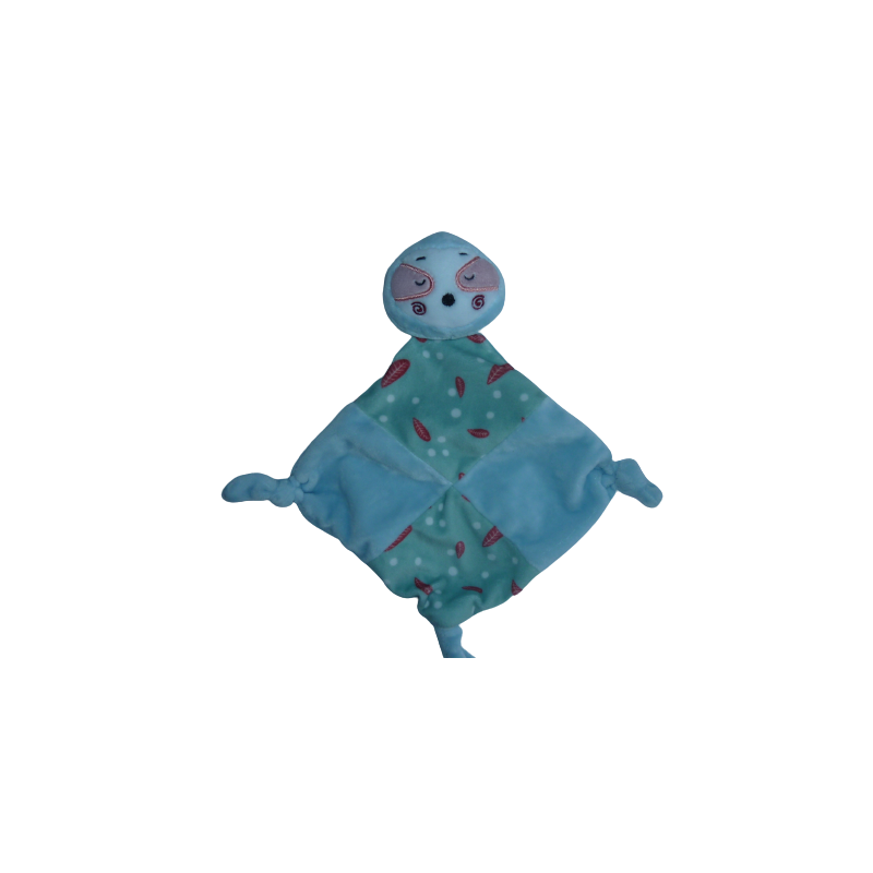Doudou paresseux plat forme losange 31 cm environ, 3 nouages, grelot, bleu vert motifs. Etat : Comme neuf. DOUDOU DIFFICILE A TROUVER