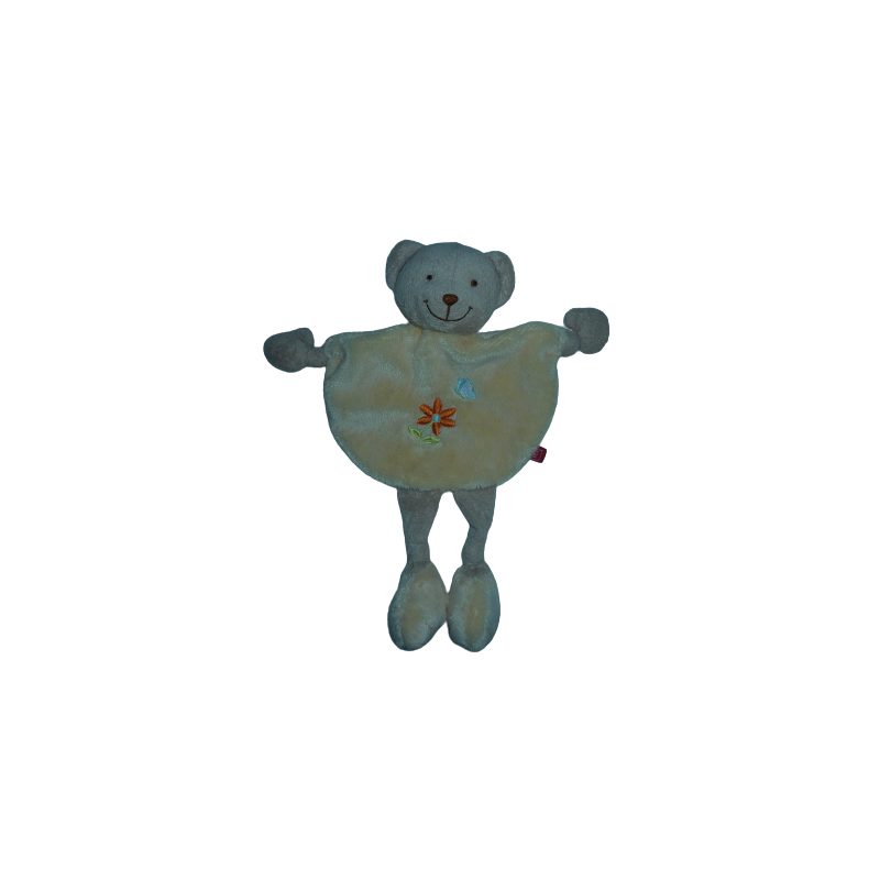 Doudou plat ours 30 cm environ de longueur, jaune motifs fleur papillon. Etat : Très bon état (étiquette d'informations coupée). DOUDOU DIFFICILE A TROUVERDestinataire :