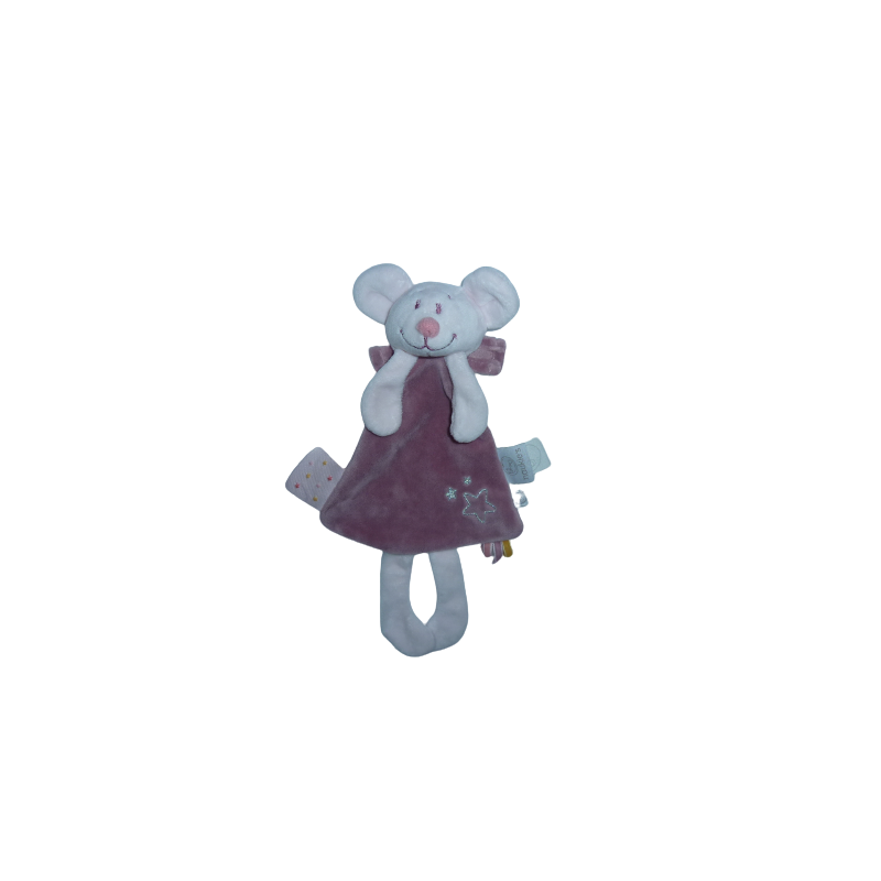 Doudou plat souris 30 cm environ, oreilles bruissantes, rose, rose des bois, étoiles brodées. Etat : Comme neuf. DOUDOU DIFFICILE A TROUVER