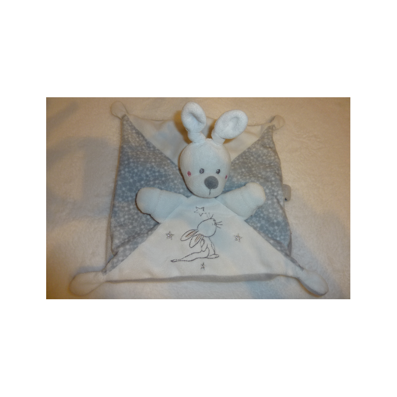 Doudou lapin plat 24x24 cm environ, attache tétine, blanc gris motifs lapin étoiles. Etat : Très bon état. DOUDOU DIFFICILE A TROUVER