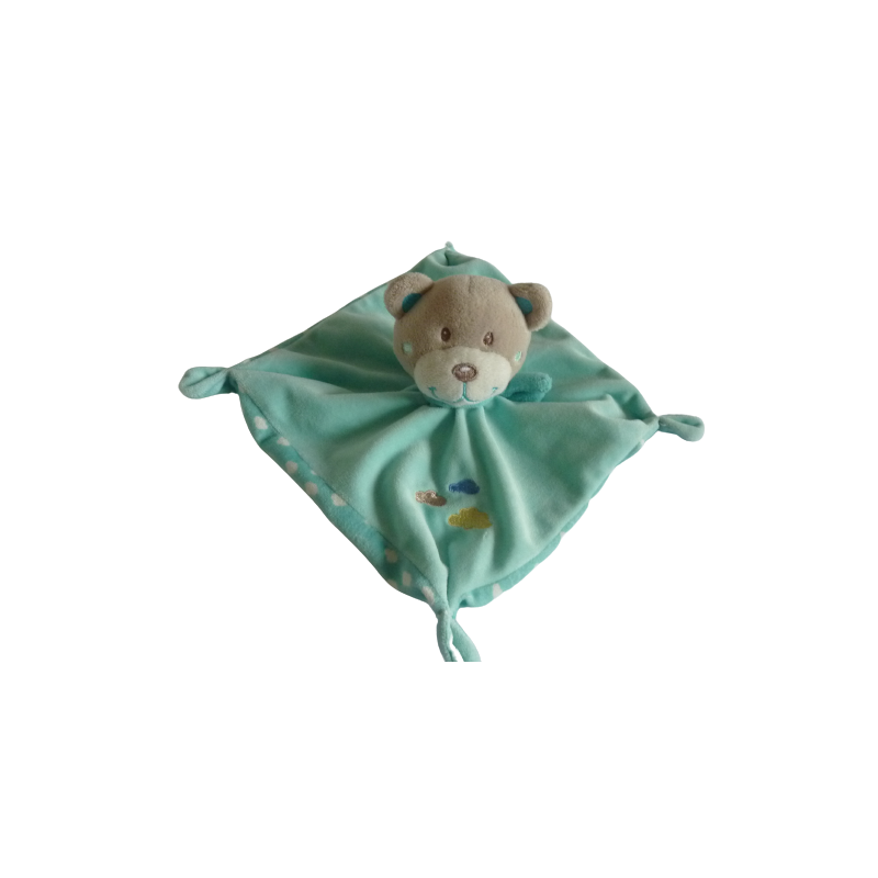 Doudou plat ours 18x18 cm environ, turquoise motif nuage. Etat : Comme neuf. DOUDOU DIFFICILE A TROUVER