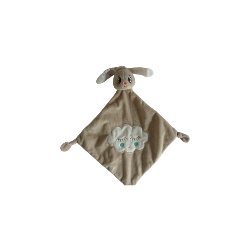 Doudou plat lapin forme losange 36 cm environ, 3 nouages, marron blanc motif nuage. Etat : Comme neuf (étiquette de la marque coupée). DOUDOU DIFFICILE A TROUVER