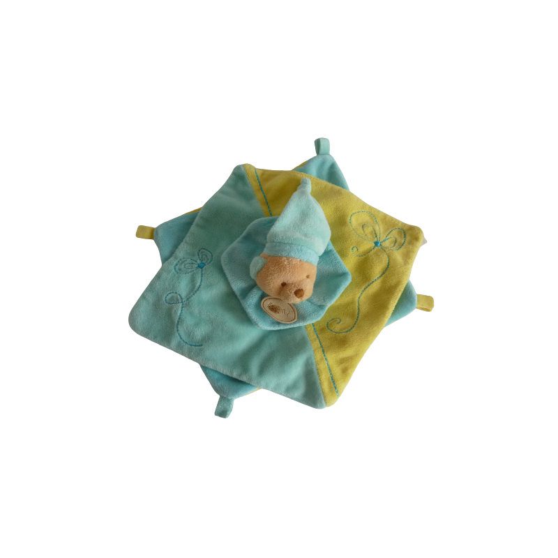 Doudou plat ours 20x20 cm environ, jaune turquoise bleu. Etat : Comme neuf. DOUDOU DIFFICILE A TROUVER